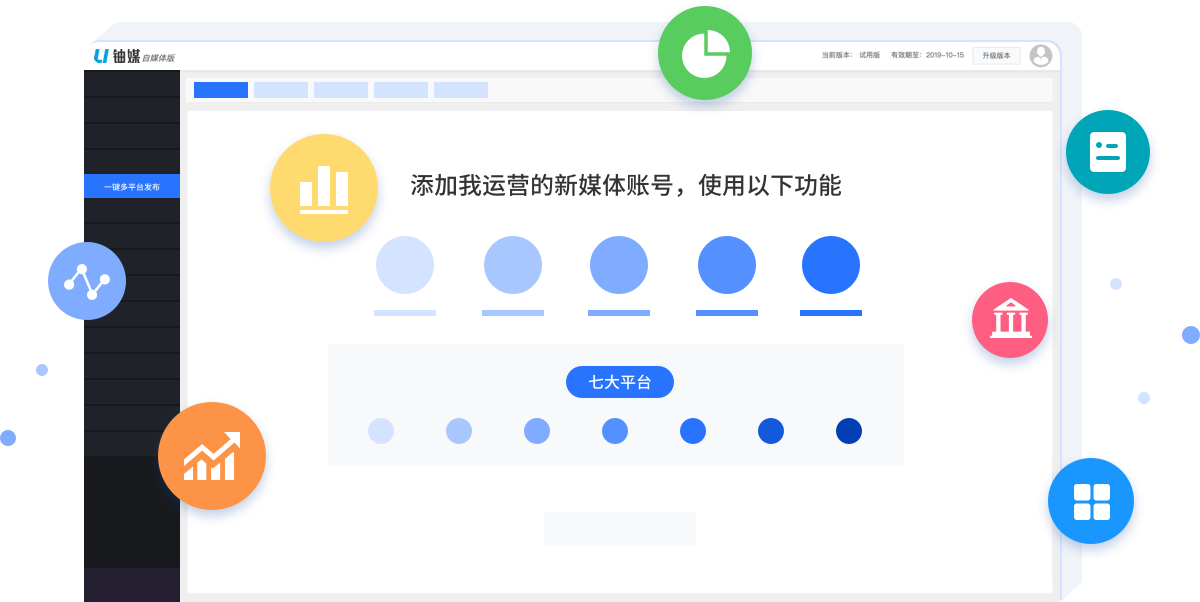 已自动为您开通试用版本。试用版可以添加5个新媒体账号,3个用户,可使用铀媒全部功能。试用版有效期3天,试用结束后将自动变为免费版本。每个账号仅能试用一次。