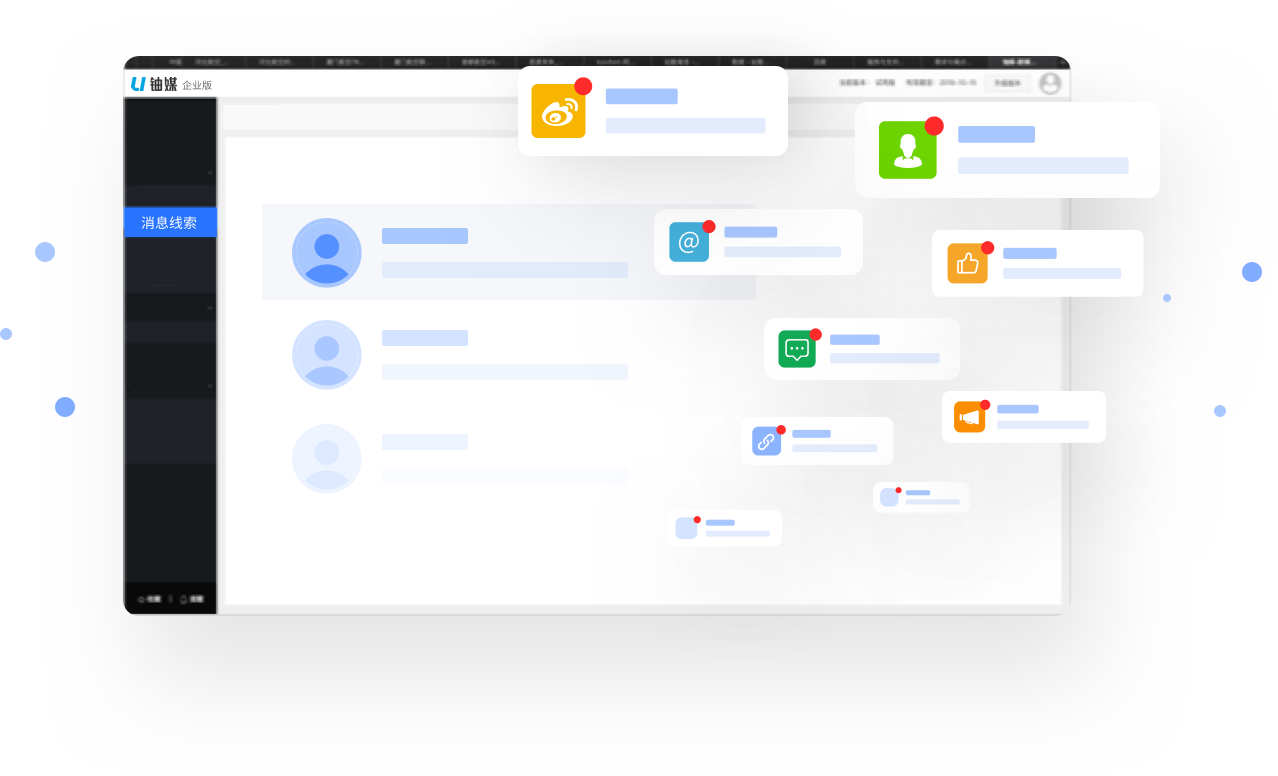 可实时收集提及、@、评论、私信、点链接、点赞等9大类型的网友反馈、全面掌握用户线索,对互动用户进行多维度的标签管理;系统自动派单、避免重复工作,也可一键创建任务协作工单、在线督办任务处理进度;还可通过批量私信等方式对有价值的客户进行精准触达,并跟踪用户的转化情况。