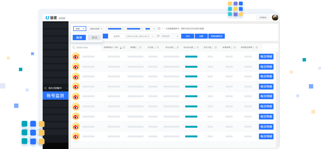 可自定义时段监测多平台账号的运营表现,全面客观掌握矩阵账号的发布质量、传播效果、粉丝画像、竞品比对等数据,一键生成数据报告并指定邮件接收;评估矩阵账号之间的联动和协同效果,加强政府对下级矩阵账号的监管和考核;还可生成榜单(支持自定义新建),对优质账号进行表彰激励。